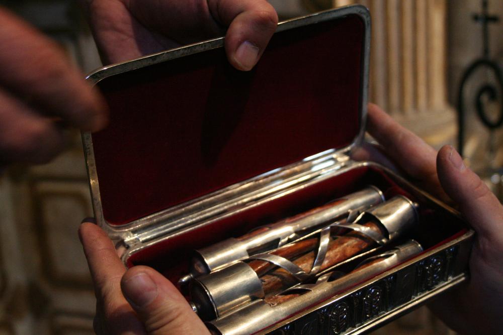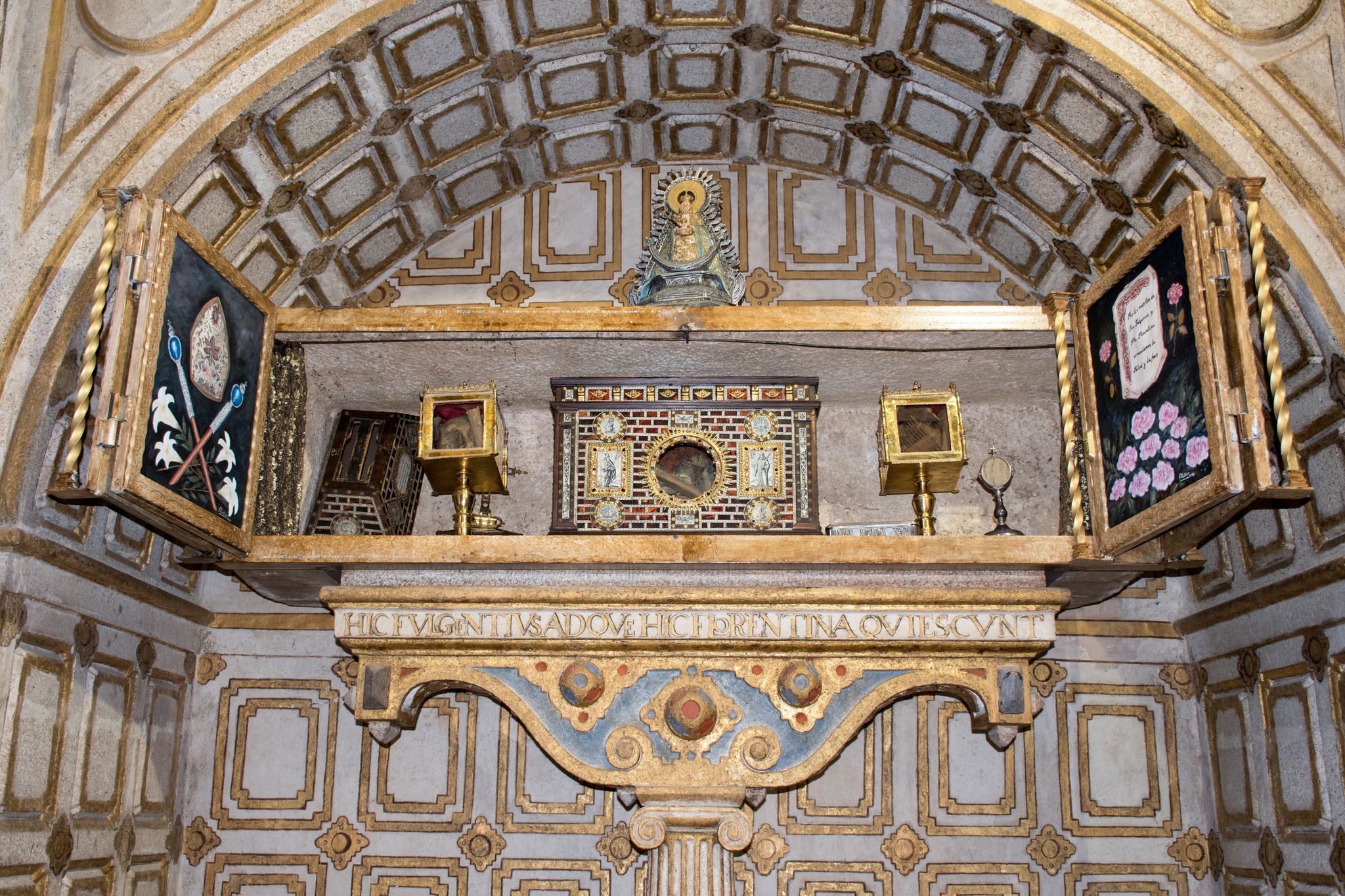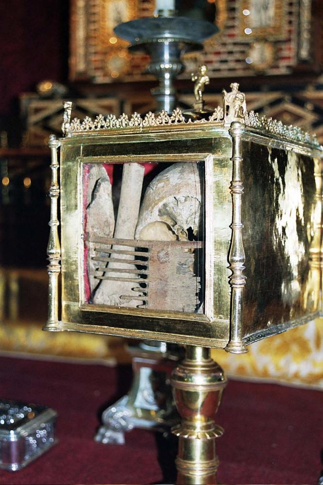 Más está en el dicho sepulcro una arquita de madera pequeña la cual no tiene llave ni hay nadie que la haya visto abierta y se dice que dentro en ella por los Prelados pasados se mandó recoger la tierra que estaba en el sepulcro y el dicho señor cura la hizo abrir con una tenaza y se halló dentro tierra en cantidad de medio celemín y con ella partes de huesos pequeños.